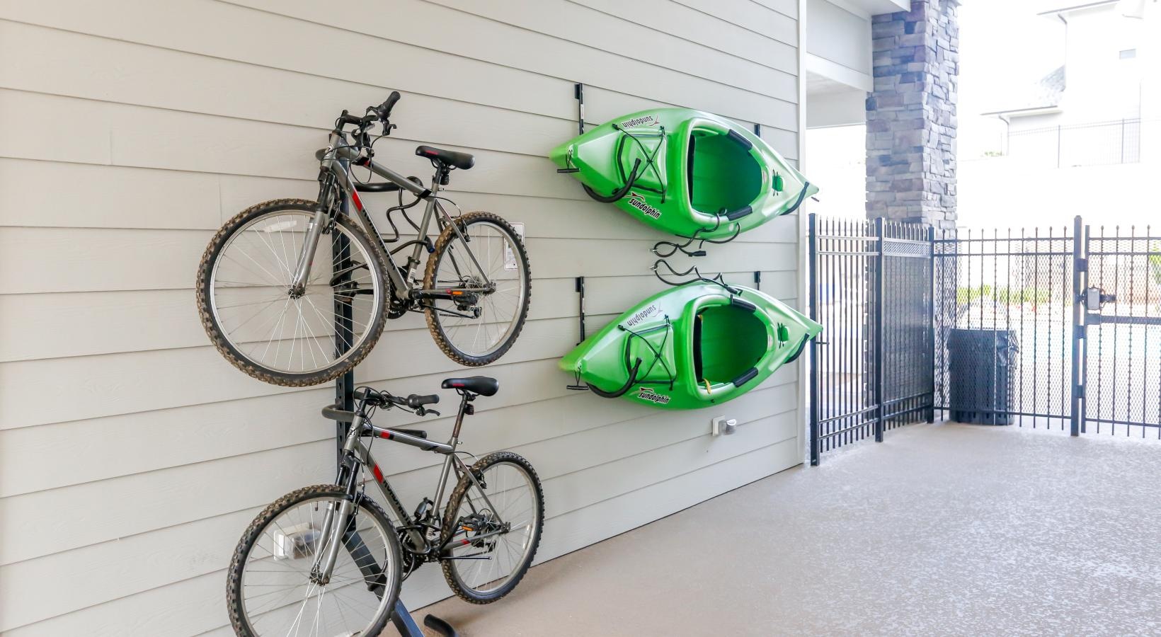• bikes and canoes hanging on a wall